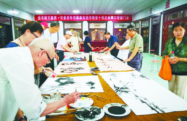 为弘扬中华传统文化,6月15日上午,应周口宏盛门业邀请,市直老干部书画研究会组织20余名书画爱好者,到该企业开展文化共建活动,并举行市直老干部书画下基层定点单位及诗书画采风基地揭牌仪式。这次活动既是一次书画艺术走出殿堂,融入社会的一种有益尝试,又是一次市直老干部老有所为的集中体现。图为老干部们现场创作书画作品。