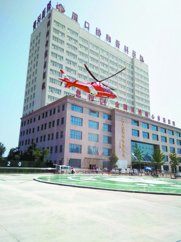 本报讯 6月24日10时15分,一架红白相间的直升机徐徐降落在周口协和骨科医院门诊病房楼前的停机坪上(如图),开启了周口医疗救援新时代。以后,我市的紧急病患也能得到更加迅捷的航空救援。