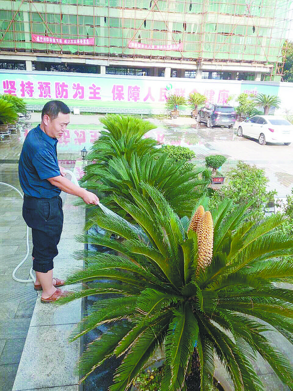 6月23日下午,位于市区太昊路的市疾控中心院内,两名工作人员正在对所栽花木进行浇灌,其中,在办公楼门前两侧摆放的10多棵铁树苍绿茂盛,有3棵1米多高的铁树开出的淡黄色呈圆柱状的花在绿叶中显得尤为耀眼,并且开的都是双花。