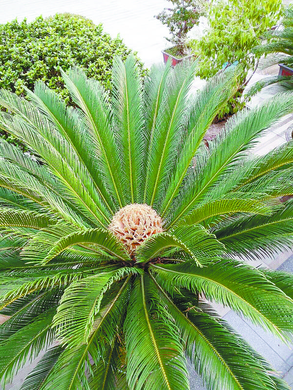 随后,记者走进看到,8棵铁树开出的花都呈淡黄色。其中,雄树的花呈圆柱状,类似一个大玉米芯;雌树的花呈圆盘状,犹如一朵大大的牡丹花。记者凑上前去仔细闻了闻,发现这些花并没有明显的气味。