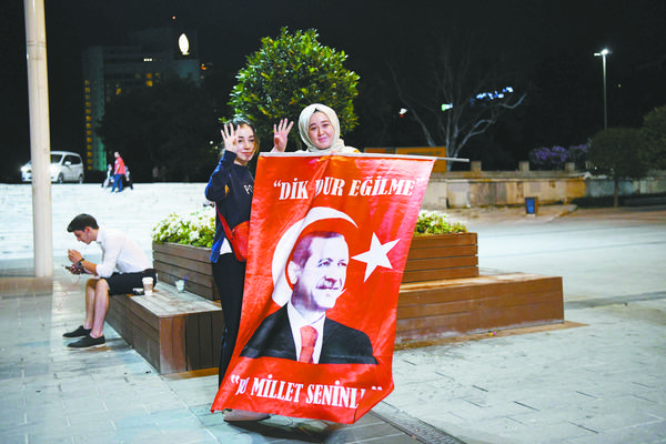 当地时间6月24日,土耳其现任总统埃尔多安的支持者在伊斯坦布尔庆祝。