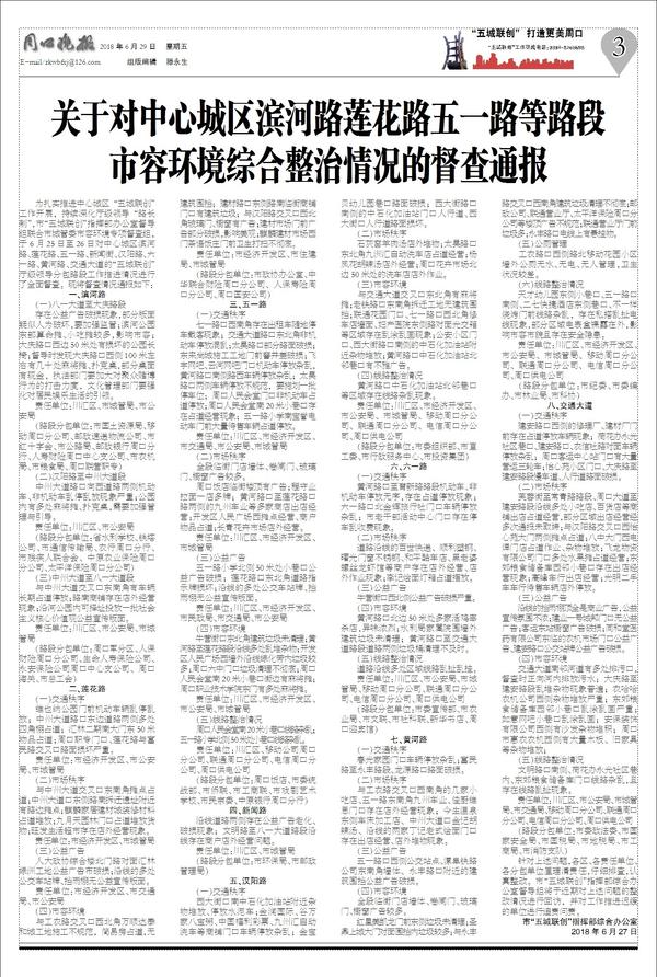 为扎实推进中心城区“五城联创”工作开展,持续深化厅级领导“路长制”,市“五城联创”指挥部办公室督导组联合市城管委市容环境专项督查组,于6月25日至26日对中心城区滨河路、莲花路、五一路、新闻街、汉阳路、六一路、黄河路、交通大道的“五城联创”厅级领导分包路段工作推进情况进行了全面督查。现将督查情况通报如下: