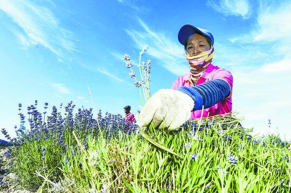 在新疆伊犁哈萨克自治州察布查尔锡伯自治县的伊犁河谷万亩薰衣草产业园里,当地一家企业的员工在收割薰衣草(6月27日摄)。