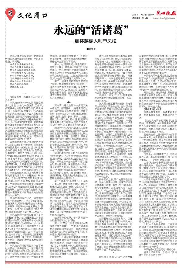 7月20日是驰名河南、饮誉京华的越调大师申凤梅辞世23周年的忌日。23年前,申凤梅带着对戏剧艺术深深的眷恋而离开了成千上万喜爱她的观众,离开了她为之奋斗一生的越调艺术。就像魏文帝曹丕说的那样,申凤梅大师凭借她那精湛的艺术和对观众的无私奉献,“不假良史之辞,不托飞驰之势,而声名自传于后”。