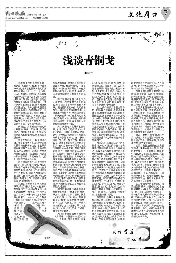 周口市博物馆收藏商晚期铜戈有两种:一种通长20厘米,宽7厘米,内长7厘米,阑厚0.7厘米,重237克,直内,较宽,在阑部偏上处,内部有一穿孔,内后部带有纹饰,阑部突起,援呈长条形,但是较短,援长有多处磕缺。另一种通长22厘米,宽6厘米,内长6.5厘米,厚2.2厘米,重281克,直内,援和内相交处有一圆形銎,援呈长条形,但是较短,略见有胡,援长有多处磕缺,銎部残断。