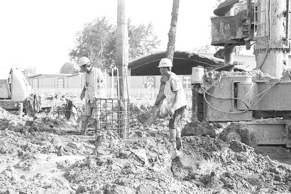 当日16时许,记者在施工现场看到,偌大的工地上各种工程机械正在紧张作业,挖掘机轰鸣着,工人们顶着炎炎烈日挥汗如雨,现场一派热火朝天的景象。