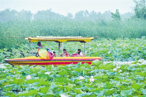 7月9日,游人在河南淮阳龙湖乘船赏荷。