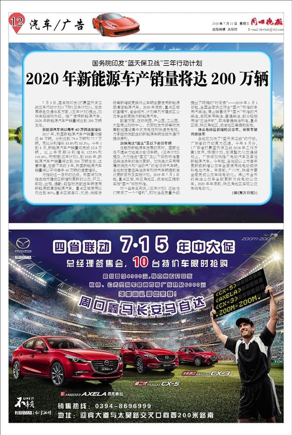 7月3日,国务院印发《打赢蓝天保卫战三年行动计划》(下称《三年计划》)。在发展绿色交通体系方面,《三年计划》提出,加快车船结构升级,推广使用新能源汽车,2020年新能源汽车产销量将达到200万辆左右。