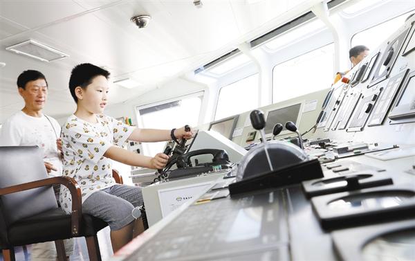 7月11日,一名小朋友坐在“东海救101”轮驾驶位上体验。