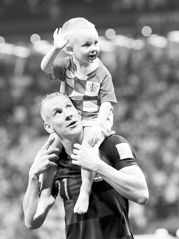 图3为7月11日,克罗地亚队球员维达赛后与孩子庆祝。新华社记 者曹灿 摄