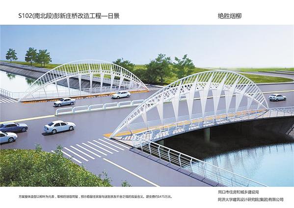 周口大道沙颍河桥景观改造,设计造型简单柔美,如行云流水,同时与沙颍河景观带相融合,给城市增添了生机与活力。周口大道贾东干渠桥以荷叶为设计元素,造型简约而不失细节。周口大道流沙河桥造型简洁大气,线条流畅,像一条青龙游弋在水面上。文昌大道幸福河桥以花瓣、叶子为设计元素,造型丰富多彩。文昌大道流沙河故道桥在中分带位置修建花坛,花坛造型庄重古朴,景石造型端庄沉稳。太清路流沙河桥以古建斗拱、窗花为元素,造型儒雅大方。太清路洼冲沟2号桥以“辐毂相依”为名,既融合环境,又有团结、合作的寓意。太清路贾鲁河桥,增加了景观造型,使人们可以重温当年贾鲁河的美好画卷。彭新庄桥以柳叶为元素,预示着留住宾客与送别亲友的不舍之情的双重含义。