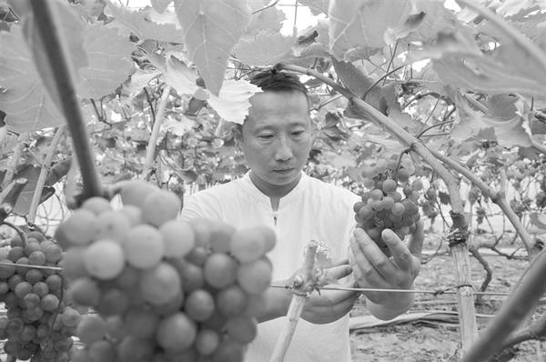 7月15日上午,商水县邓城镇天力葡萄种植合作社员工在大棚内采摘成熟的葡萄。该合作社由河南省优秀大学生村官张耀等人创办,成立8年来,从全国上千个葡萄品种中筛选出最受消费者喜爱的10多个品种,通过农业科技手段,使鲜果采摘期从6月持续到11月,亩均收入4万多元。目前,该合作社已带动周边乡镇发展特色果蔬5000多亩,为贫困户提供就业岗位800多个,成为推动当地经济发展和农民增收的主导产业。该合作社先后被授予“河南省优秀农民专业合社”“周口市文化产业示范基地”荣誉称号。 记者 付永奇 摄