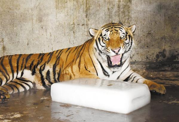 7月18日,河北省邯郸市动物园的东北虎趴在冰块旁休息。