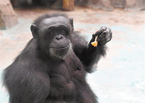 7月24日,郑州市动物园里的黑猩猩“菲莉”在吃冰冻水果。
