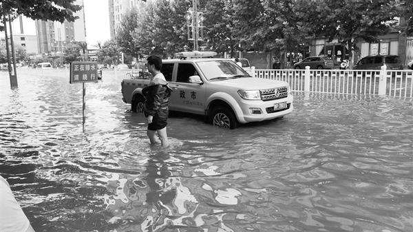 本报讯 7月30日6时许,周口中心城区突降暴雨,八一大道北段、文昌大道等路段积水严重。早班高峰期,不少市民涉水上班。市城管局市政抢险突击队员第一时间进入“战斗”状态,冒雨奔波在排水第一线。