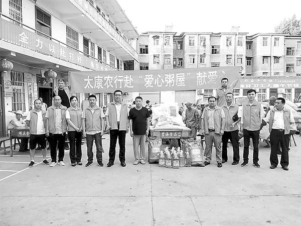 近日,农行太康支行组织干部员工组成志愿者服务队,到太康县“爱心粥屋”开展献爱心活动,送去米、面、油等物品,并帮着切菜、盛饭、端饭,受到“爱心粥屋”和广大环卫工人的一致好评。