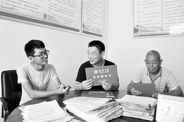 商水县巴村镇董村党支部和驻村工作队认真做好贫困大学新生入学工作,联合本地企业对今年大学新生每人资助2000~3000元,受到社会好评。图为周口通讯传输局驻董村干部王东华(中)在统计该村大学新生录取信息资料。记者 付永奇 摄
