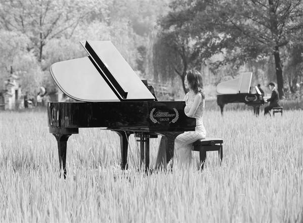 8月5日,在张家界黄龙洞风景区,钢琴爱好者在稻田中演奏。