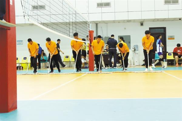 8月6日上午,为保障省十三运会排球比赛顺利进行,志愿者在比赛暂停间隙,抓紧时间打扫场地。记者 王凯 摄