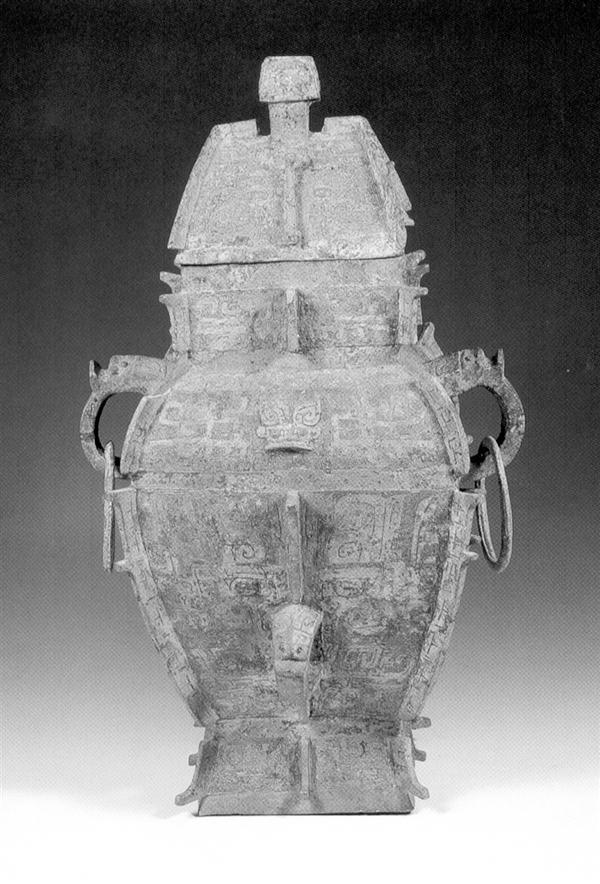 西周“长子口”方铜罍,盖呈四阿攒顶式,中间置方形钮柱,钮顶亦为四阿屋顶式,四边内折为子口,与器口套合。器口呈长方形,宽平沿,直颈,溜肩,深弧腹,平底,长方形圈足外撇。肩部两侧置对应的半环形兽首耳,衔大圆环,两耳之间的腹下部一侧置半环形兽鼻钮。盖、器身四角及四面中部均有扉棱,扉棱分盖、颈、肩、腹和圈足五段,上下对应成一直线,唯肩部无中间扉棱。扉棱呈条状,上端顶部伸出一凸齿,腹肩部扉棱伸出两齿,圈足处扉棱凸齿在下。盖顶亦有一条脊扉。盖顶屋形钮柱正面饰卷云纹,侧面饰探头方目的夔龙纹,不甚清晰。盖之四坡面纹饰分上、下两组,阴线相隔,正坡面上层施两条对首的夔龙纹,夔龙探头勾喙,顶有羽刺,小圆目,背负弯角,尾上卷,肢下置双足;侧坡面上层用三角状纹填角。下层四面均施倒置的兽面纹,兽面外卷角,角外侧饰刀形羽饰,臣形目,方圆睛凸起,条状瞳孔,桃形耳,咧嘴,嘴角内卷,足肢填角,以中间扉棱作鼻梁,面目狰狞。器体纹饰与扉棱相对应,自上而下分四组,即颈部、肩部、腹部和圈足,各组之间空带相隔。颈部和圈足纹样基本相同,以中间扉棱为中心,两侧各饰一夔龙纹,夔龙对首,探头勾喙,头立短羽刺,圆方目,背负弯角,躯干分为二肢,上肢较长,尾上卷,下肢较短,尾呈刀矩状,足前伸,有三趾。肩部亦施对首夔龙纹,与颈部和圈足上夔龙的区别是:大张口,长鼻上卷,下唇下翻,两肢相距较远,上肢有后足,下肢长于上肢。肩部正面两夔龙之间浮雕一兽面纹,兽面为桃状角,臣形目,圆睛凸起,无眉,小叶形耳,高额鼻,阔口。腹部兽面纹分上下两组,阴线相隔。上组兽面纹较大,大角内卷,粗角根,角外侧立羽饰,小勾眉,大臣形目,方圆睛凸起,嘴角内卷,外置肢足;下组兽面纹较小,外卷角,无眉,其余形制同上组兽面纹基本相同。全器均以云雷纹衬地。双耳、鼻钮之圆雕兽面相同,外卷角,勾眉,臣形目凸睛,高鼻梁,张口露齿,兽口下有凸面,用手置器时可应拇指。通器从顶钮至圈足,上下共施八组纹饰,即五组夔龙纹和三组兽面纹,纹样除颈、圈足两组相同外,其余各组各具特色,加之圆雕、浮雕等技法的使用,可谓绚丽多姿,美不胜收。器口内壁有铭文“长字口”三字,字迹清晰,盖内壁亦有“长子口”三字,但字迹不清。通高47.6厘米,腹深22.8厘米,口边13.1厘米×11.3厘米,圈足底边14.3厘米×12.6厘米,壁厚0.3厘米,重6900克。