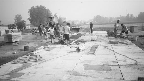 在烈士陵园记者看到,面积6400平方米的纪念广场,近四分之一的地面已经铺设花岗岩,数十名工人正埋头铺砖。广场中央,吊车轻轻地“抓”起长19.36米、宽3.4米、重32吨的纪念碑碑身钢结构,分两次完成吊装,这标志着纪念碑主体框架结构完成。施工方河南昊锦集团有限公司负责人张经理告诉记者,他们于6月24日进场,投入挖掘机3台、推土机3台、压路机3台,采取两班倒、人歇机不停的方式,倒排工期,加紧施工。“按照设计,纪念广场采取分层施工,首先是素土压实,共分12层,每层25厘米厚,每铺一层都需夯实,仅此项工作就完成土方量2.5万立方米。其次,铺设20厘米厚石子层。最后,铺设20厘米厚混凝土。这些工序都已完成,目前正在进行广场铺砖、修建纪念碑”。