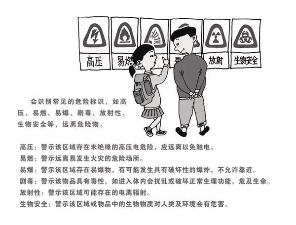 会识别常见的危险标识,如高压、易燃、易爆、剧毒、放射性、生物安全等,远离危险物。