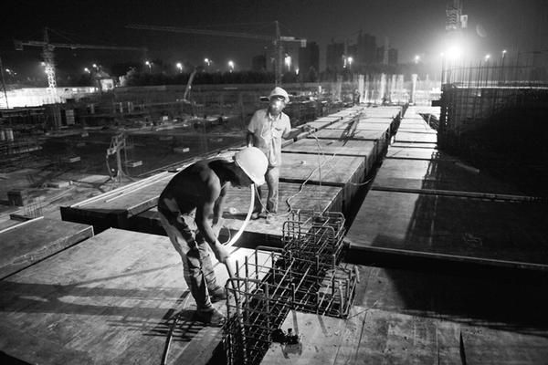 21时许,记者在泰和家园项目施工现场看到,施工人员正在进行钢筋切割,他们为第二天的工作做着准备;A1#楼正在进行垫层浇筑,A8#楼正在进行负一层及周边地库的钢筋绑扎及模板加固,A9#楼正在进行负一层墙柱钢筋及模板内架搭设;现场2台钢筋切割机、9台塔吊在不停地运转,40多名施工人员各司其职,工地上如火如荼。