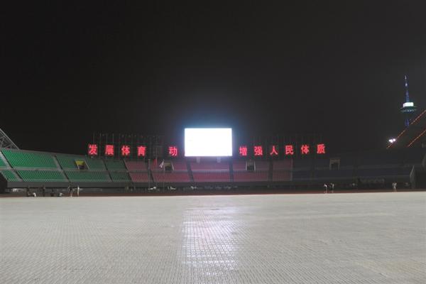 刚步入体育场,首先映入眼帘的是一块巨大的屏幕,虽然还没有安装完毕,但它在十几盏灯的照射下显得格外壮观。据了解,这个屏幕有2000平方米,被称为“中原第一大屏”,开幕式当天,会场内的综合性的信息将会在这个大屏幕上完整反映出来,目前施工正在紧张进行中。除了多了一块“巨屏”,体育场中间足球场上绿油油的草地也不见了。通过了解得知,原来是工作人员在草地的上面铺满了灰白色的“护草垫”,这样既可以保护场地也便于开幕式的文艺节目表演。