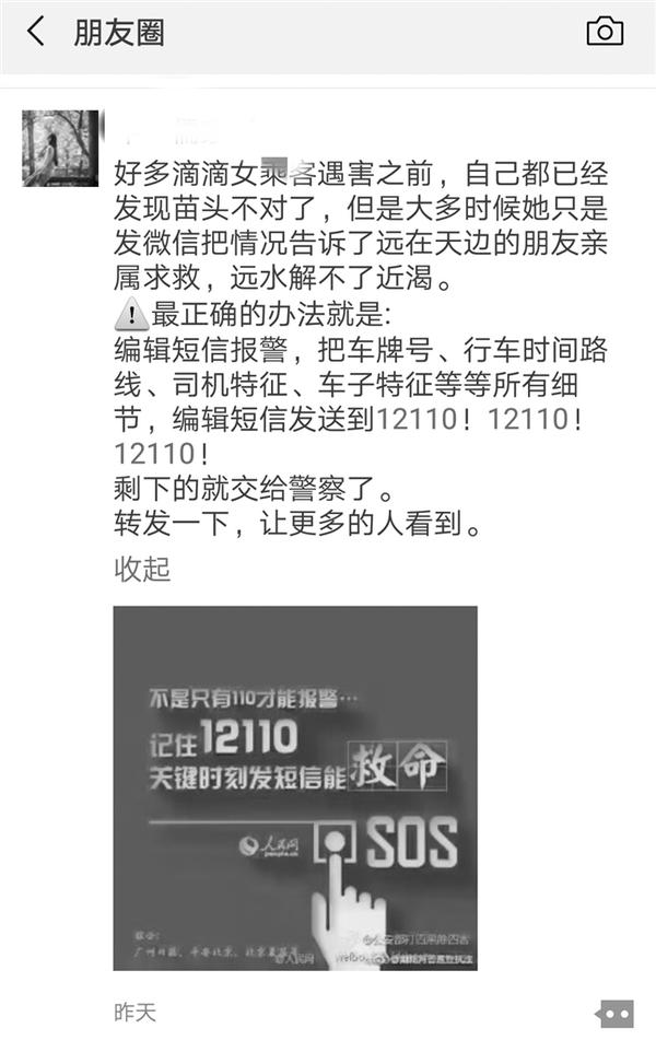 日前,浙江温州一名20岁的滴滴女乘客遇害。案件发生后,不少网友在微信、微博等平台,对于遇到突发事件如何采取自救进行探讨。其中,一条内容为“滴滴女乘客遇害之前,就已经发现苗头不对,但她却通过微信向远在天边的亲属求救。遇到这种事情,最正确的做法就是编辑短信报警。把车牌号、司机特征、车辆特征等细节,通过短信发送到‘12110’,剩下的就交给警察。”的信息获得很多人赞同。“在侵害发生时,如果用语音报警可能激怒犯罪分子,引起犯罪行为升级。所以我认为发送短信报警这种做法比较可行。”网友“薇薇儿”说。