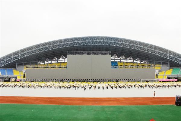 9月2日上午,在市体育中心体育场,伴随着激昂的音乐,参与开幕式节目表演的学生个个精神抖擞,在导演的口令下不断变换队形。