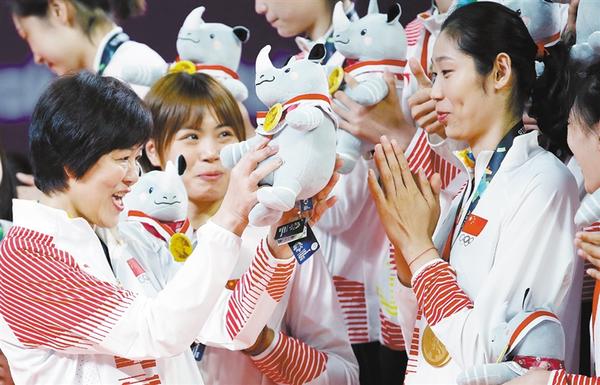 当日,在第18届亚运会女子排球决赛中,中国队以3比0战胜泰国队,获得冠军。