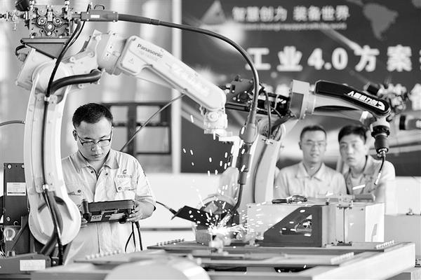 9月5日,河北创力机电科技有限公司工人对焊接机器人进行焊接实验。