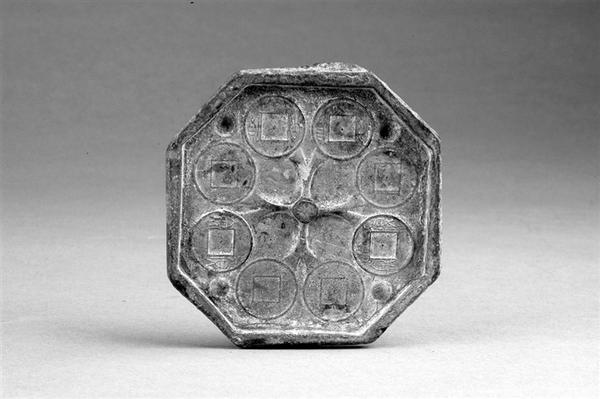 该器物对角长8.9厘米,厚0.7厘米,铜质,体为八边形,有边栏,边栏长短不一,相对两边长短相同,短边中部向里0.3厘米处,有阴阳间错、铆钉各一对,整条范模内有钱范八枚:正面四枚,背面四枚。面文为小篆悬针体“货泉”二字,方孔。每枚钱范有支槽相接,铸槽从铸口至钱范呈漏斗状,背面为素面。