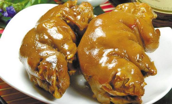 猪蹄,有的地方叫猪脚、蹄花,有的地方叫猪手、蹄膀,猪蹄可卤、可烧、可蒸、可炖。以前,赶考的学子住到店里,精明的店主会给他们炖猪蹄、卤猪蹄,称猪蹄为“朱题”,取金榜题名之意,即使价格高一些,考生也不好讨价还价,为的是讨个好彩头。有一年我去陕西,见那里有送猪蹄的婚俗。结婚前一天,男方要送4斤猪肉、一对猪蹄,这称为“礼吊”。女方将“礼吊”留下后,还要将猪前蹄退回。婚后第二天,夫妻俩要带两份挂面及猪后蹄回娘家。娘家留下挂面,退回后蹄,俗称“蹄蹄来,蹄蹄去”,表示今后他们往来密切、骨肉不分。