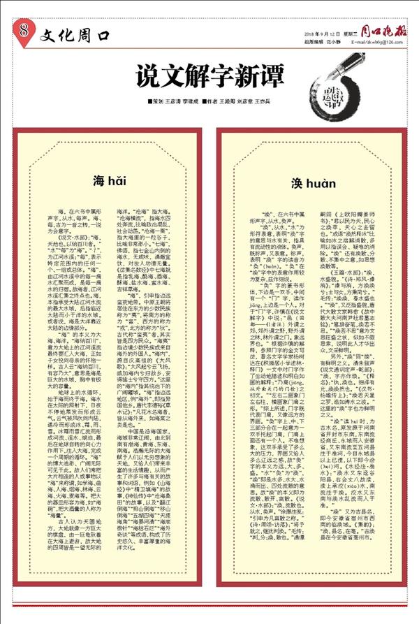 中国是沿海国家,海域非常辽阔,由北到南有渤海、黄海、东海、南海。浩瀚无际的大海赋予人们以无穷想象的天地,又给人们带来丰富的生活情趣,从而产生了许多与海有关的故事和词语,例如《山海经》中“精卫填海”的故事,《神仙传》中“沧海桑田”的故事,以及“翻江倒海”“排山倒海”“移山倒海”“五湖四海”“天涯海角”“海晏河清”“海底捞针”“海枯石烂”“海外奇谈”等成语,构成了历史悠久、丰富厚重的海洋文化。