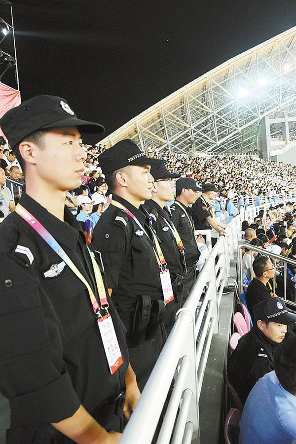 省运会开幕式当天,1900多名安保人员一大早就来到市体育中心,值守在开幕式场馆内外,尽职尽责执行现场安保任务,确保开幕式安全顺利进行。