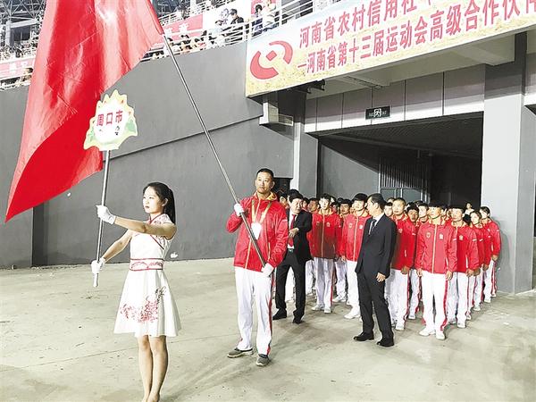 昨日20时,河南省第十三届运动会开幕式在市体育中心体育场拉开帷幕。在开幕式现场,武警战士高举国旗迈着坚实整齐的步伐走在第一方阵,当武警战士走过主席台后,各代表团陆续入场。作为东道主,周口市代表团最后一个步入体育场,旗手是全国跆拳道冠军樊海青。