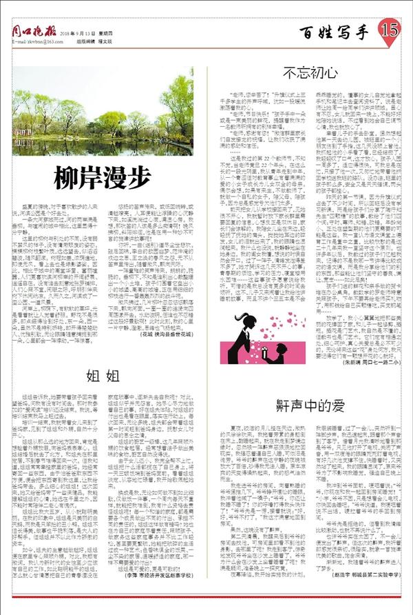 微风拂过,几片柳叶忽忽悠悠飘落下来,飘向河面,一圈一圈的涟漪向四周荡漾开去。水动波明,任谁也不忍错过这般好景致啊!此时此刻,我的心里一片宁静、澄澈,思绪也飞扬起来。