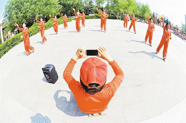 河南省第十三届运动会在我市举办,掀起了周口社会各界的健身热潮。在商水县,形式多样的健身活动更是精彩纷呈。每天早晨,人们不约而同来到阳城公园打球、跑步、唱戏,享受初秋带来的清新和凉爽。图为一老年舞蹈队在阳城公园跳广场舞,领队阿姨在用手机拍照,发朋友圈秀健身。 通讯员 郭涵泽 摄