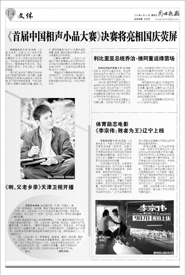 新华社北京9月12日电 (记者 史竞男)记者12日从有关方面获悉,《首届中国相声小品大赛》决赛将于10月2日至8日在央视播出。节目旨在传承中国民间特色传统文化,繁荣语言节目创作,推出优秀新人新作,为观众献上一场喜剧盛宴。