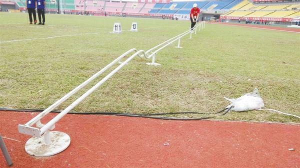 9月15日上午,一个造型奇特的装置出现在田径比赛的铅球赛场旁。记者注意到,该装置长约10米,摆放在铅球比赛赛场旁。工作人员把参赛选手投掷出的铅球放在该装置上,铅球就会从一头滚到另一头。据介绍,这是一种接收装置,专门运送铅球。记者 张洪涛 摄