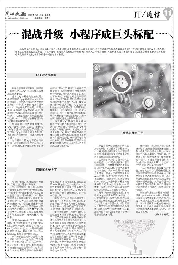 根据QuestMobile报告,微信、QQ、支付宝在2018年6月的MAU(月活跃用户规模)分别为9.3亿人、6.8亿人和5.66亿人,为用户规模排名前三的App,截至目前,以上三大超级App都在小程序战场碰头。