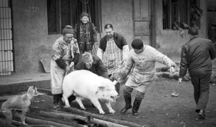 王六长相如李逵,看似鲁莽实则是个细心人。在乡下,一进腊月便有了浓浓的年味,王六的生意就到了最红火的时候。他在集上有自己的肉案子,要杀猪卖肉,还要帮乡亲杀猪。都说杀猪匠天生有股杀气,走进猪圈往猪身上瞅一眼,猪就会感到大祸临头,小眼怒睁,两股打颤。待杀猪匠走进猪圈,猪就会满圈乱窜,体型健硕、脾气暴躁的猪前蹄会趴下,屁股耸起和人怒目相对,突然夺路而逃,顺便把杀猪匠撞个“狗啃泥”。围观的乡亲们看后笑得合不拢嘴,接下来会有一场“人猪大战”的好戏。王六杀猪,从无此类闹剧。他进猪圈,会先扔一块红薯或烂骨头给猪,猪贪吃没了戒备意识。然后他会给猪抓痒痒,待猪哼哼着十分惬意时,他双手抓住猪的后蹄抬起。后蹄悬空,头部着地,猪空有力气却使不出来。随后,周围帮忙的人涌进来将猪按倒在地,任猪再不甘心、哀嚎,却也只剩下被人捆绑着嘴里喘着大气的份儿。