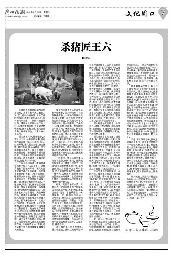 王六兄弟六个,他是老小。乡下人没文化,起名字图省事,有时就按排行喊,如王三、李四、马五、赵七等等。王六五大三粗、膀大腰圆、额广面阔、满脸络腮胡,因为他的职业是屠夫,加上长的样子就是屠夫相,若是腰里再插两把板斧,天落黑时突然从高粱地里跳出来,活生生就是一个剪径的李逵,能把人吓个半死。