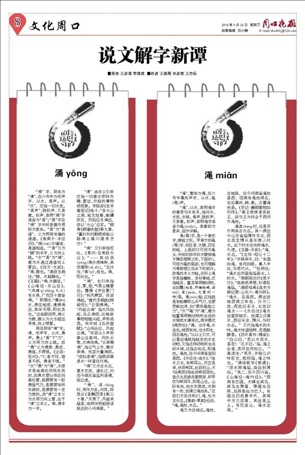 “涌”字,异体为“湧”,在六书中为形声字,从水,甬声。从“水”,泛指一切水流。“甬声”,既标声,又表意。标声,表明“涌”字读音为“甬”;“甬”字在“涌”字中的表意作用较为复杂。“甬”为“甬道”,义为两旁有墙的通道。《淮南子·本经训》:“脩(xiū)为墙垣,甬道相连。”“甬”又为“踊”的本字,义为向上跳。“水”“甬”为“涌”,意为水通过通道向上冒出。《说文·水部》:“涌,滕也。”清段玉裁注:“滕,水超踊也。”《玉篇》:“涌,水滕波。”《山海经·东山经》:“(跂踵qǐ zhǒng 之山)有水焉,广员四十里皆涌。”郭璞注:“瀵(fèn)水,源在地底,濆沸涌出,其深无限,即此类也。”这些都说明,涌义为滕,滕义为火水超出寻常,向上喷冒。