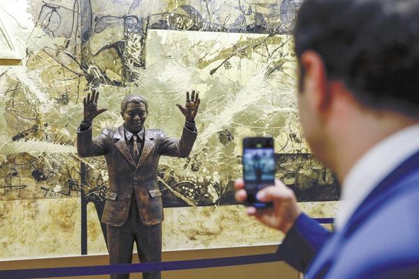 当地时间9月24日,在纽约联合国总部,一名男子用手机拍摄南非前总统曼德拉像。 为纪念南非前总统曼德拉诞辰一百周年,由南非政府捐赠的曼德拉像24日正式“入驻”纽约联合国总部。 新华社记者 李木子 摄