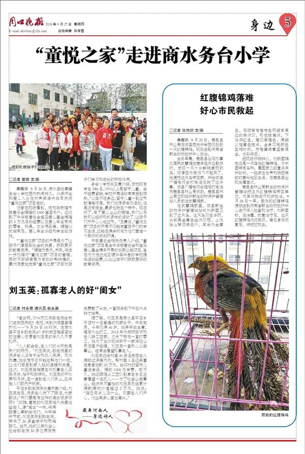 本报讯 9月25日,鹿邑县林业局在该县西关中学西侧救助一只红腹锦鸡,现已送到河南省野生动物救护中心救治。