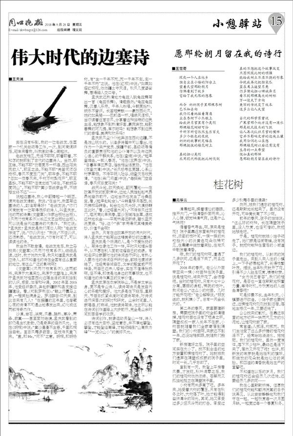 老战友相见,无话不聊啊,聊着聊着,不知怎的就聊到了古代的边塞诗人。当然,聊王维,不能不聊“劝君更尽一杯酒,西出阳关无故人”,聊王之涣,不能不聊“羌笛何须怨杨柳,春风不度玉门关”,聊岑参,不能不聊“忽如一夜春风来,千树万树梨花开”,聊王昌龄,不能不聊“但使龙城飞将在,不教胡马度阴山”,不能不聊“黄沙百战穿金甲,不破楼兰终不还”……
