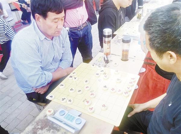 10月1日,在商丘市民权县举办的迎国庆象棋公开赛上,我市棋手赵昌礼(左)在7轮比赛中发挥出色,以6胜1和积13分的成绩夺得第一名。图为比赛现场。记者 王凯 摄
