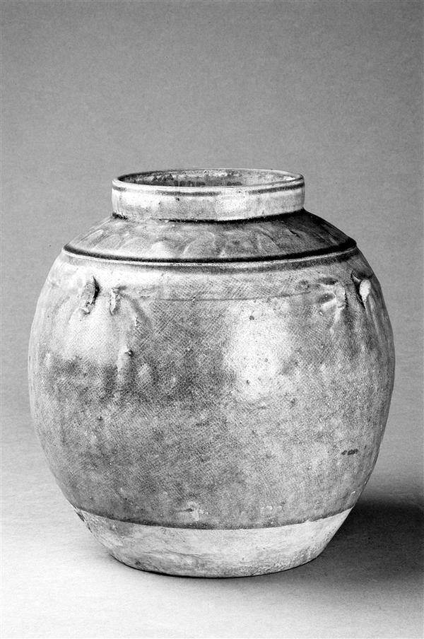 青釉四系瓷罐高21.5厘米、口径10.5厘米、底径12.7厘米,体呈球状,圆唇、直口、斜角、肩附对称四横系。鼓腹,腹下收小;颈部饰水波状划纹;肩部、腹部均饰拍印布纹,并刻阴线弦纹四周。平底内凹,通体施青色釉,近底部无釉,胎质灰黄。